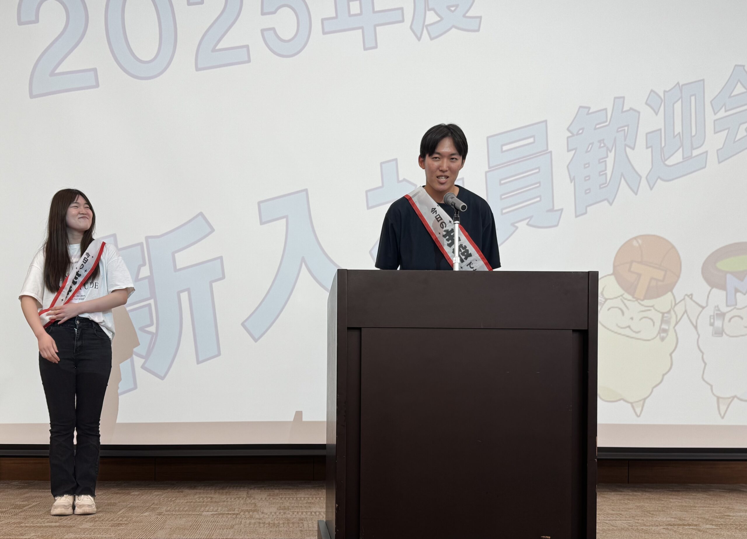 新入社員の2名は、皆んなの前で緊張しながらも笑いを入れながら