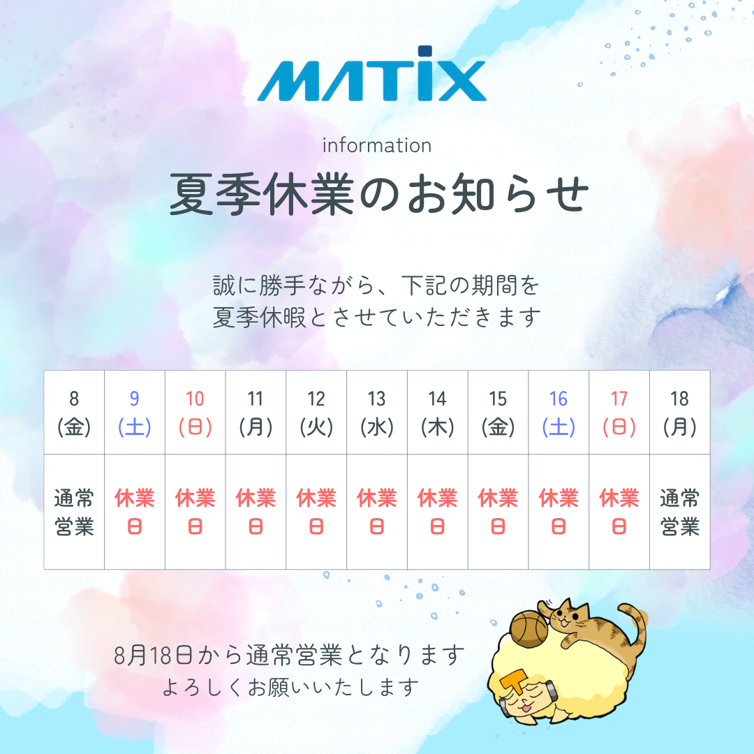 夏期休業のお知らせ 誠に勝手ながら、8/9(土)~8/17(日)まで休業いたします。 8月18日(月)より通常営業いたします。 皆様にはご不便とご迷惑をおかけいたしますが、何卒ご容赦くださいますようお願い申し上げます。 CONTACT ご相談・ご質問等ございましたら、お気軽にお問い合わせください。 お問い合わせ
