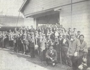 ※写真は、昭和初期の本社での集合写真です(中央右寄りで座るのが、創業者松川与郎氏)